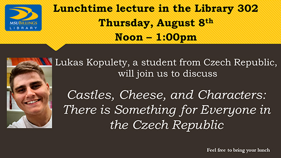MSU BILLINGS NEWS — Montana State University Billings will host a lunchtime lecture, “Castles, Cheese, and Characters: There is something for everyone in the Czech Republic” in the library on August 8.