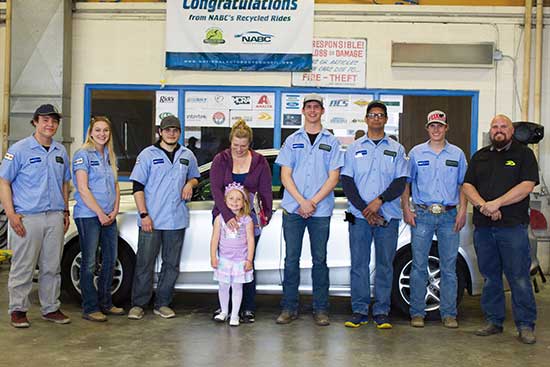 MSU BILLINGS NEWS—The auto body program at City College at Montana State University Billings partnered with the National Auto Body Council’s Recycled Rides program for the second year to help with the donation of a refurbished car to a local family. Micki Morrow and her daughter were presented with the vehicle at the City College Car Show and Collision Repair Exploration Day in April.