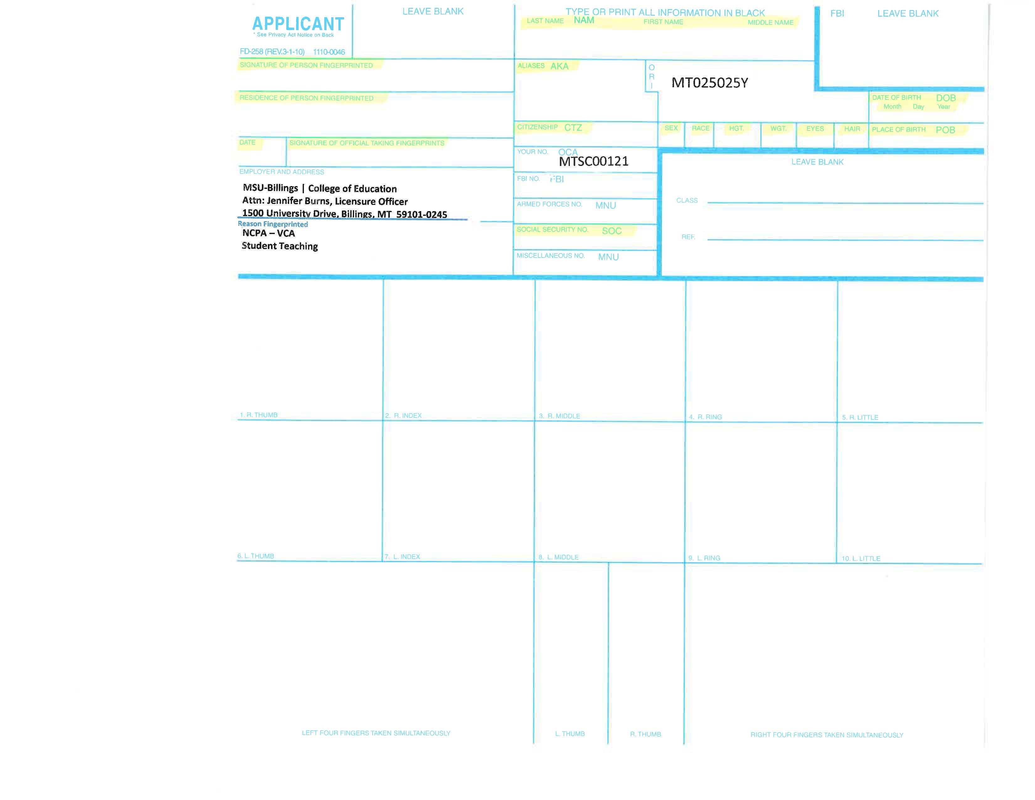 In order to streamline this process and prevent confusion please bring your completed Fingerprint card and a check or money order for the amount of $25 made out to the Montana Department of Justice (MT DOJ) to the Field Experiences and Licensure office (coe 263). Nicole or Traci will provide you with the required paperwork at this time.