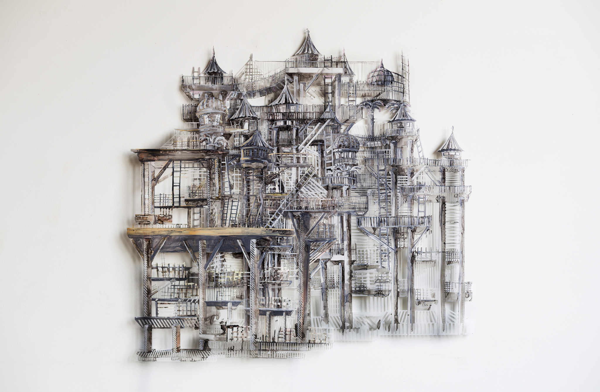 Jodi Lightner, Invisible Cities – Trope, 2015. Acrylic and Ink on hand cut Mylar, 37” x 43.”