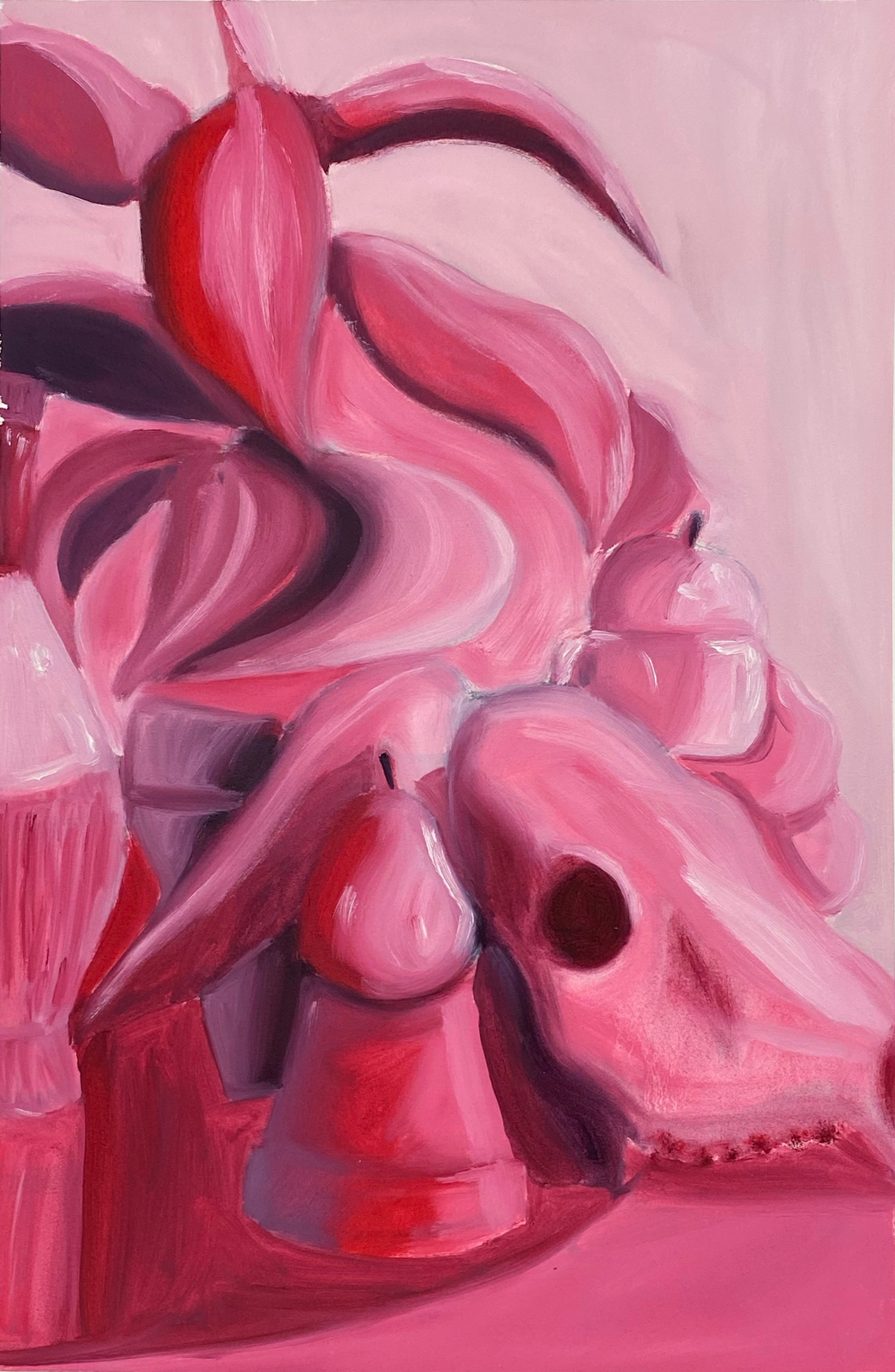My pieces Pink View and Somebody Call Wheezer are some of my very first paintings I've ever done in oil paint. I took Intro to Painting this semester and my motivation for them was the challenge of working with materials and techniques that were so new and foreign to me. They are both still life paintings, so I wasn't able to come up with my own objects to paint, but I was able to pick my colors which made those assignments fun. I was able to bring them from boring real life colors into something eye-catching and imaginative. I wanted these still life paintings to somehow still pertain to me in some way, so I used my favorite color in Pink View and was able to give one of my paintings an unusual name that only I know the meaning behind. The material I used in these pieces were oil paints, oil paint solvent, arches, oil paper and thin wood. These were created for some of our first Intro to Painting assignments using still life.