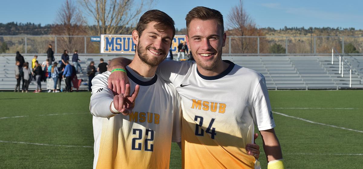 • Two MSUB Soccer Mens Soccer players on a soccer field