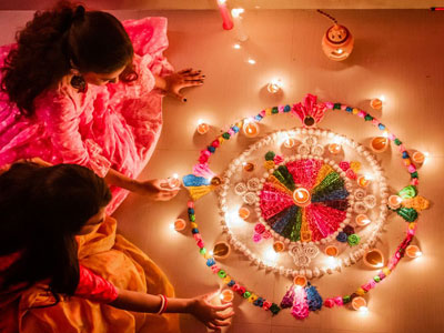 Indian people wear new traditional clothes, decorate their homes with lights, candles and earthen lamps to bring out light and color. Indians also typically make Rangoli, which is an art design created on floors using sand colors and chalk. In the evening, this festival is celebrated by visiting temples, lighting candles and enjoying homemade delicacies. Families come together with dancing, food, decorations and lively traditions.