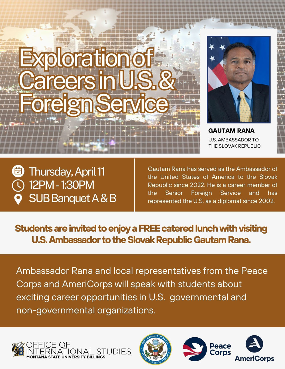 Noon-1:30pm – Exploration of Careers in U.S. & Foreign Service – at MSU Billings SUB Banquet A & B – Ambassador Rana and local representatives from the Peace Corps and AmeriCorps will speak with students about exciting career opportunities in U.S. governmental and non-governmental organizations. Catered lunch will be served