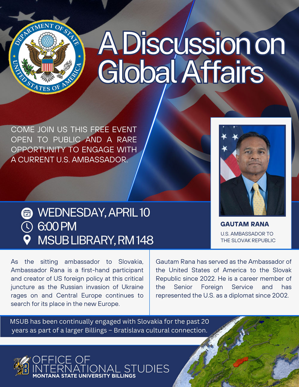 6:00-8:00pm – A Discussion On Global Affairs – at MSU Billings Library Room 148 – United States Ambassador to Slovak Republic, Gautam Rana, speaks on US foreign policy, followed by Q&A.