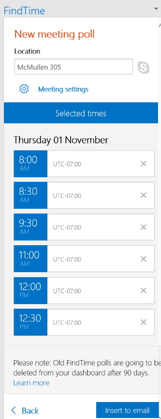 The selected times will then be displayed. Enter a meeting location and then after verifying the times are correct, click the Insert to email button.