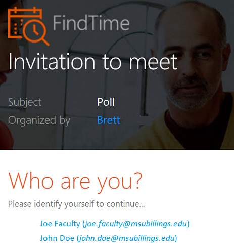 After sending the email, each recipient will receive an email with a link to taking the availability poll. From within the email, click the Select options button to get started. You'll first be asked to identify yourself. Click your name in the list.