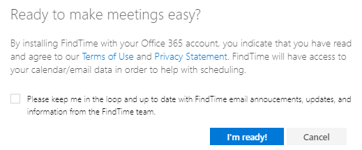 3) Choose whether to join the mailing list for updates to FindTime and click the I'm ready! button.
