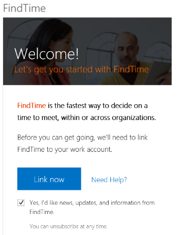 Clicking the Reply with Meeting Poll button the first time will ask you to link your app to your Office 365 account. Choose whether to received news updates and then click the Link now button.