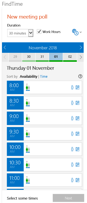 Ever spend more time deciding when to meet than actually meeting? Microsoft FindTime is here to solve the problem. FindTime is a polling application that helps find common availability among your meeting attendees. Scheduling a meeting is done in three easy steps: