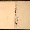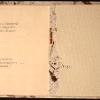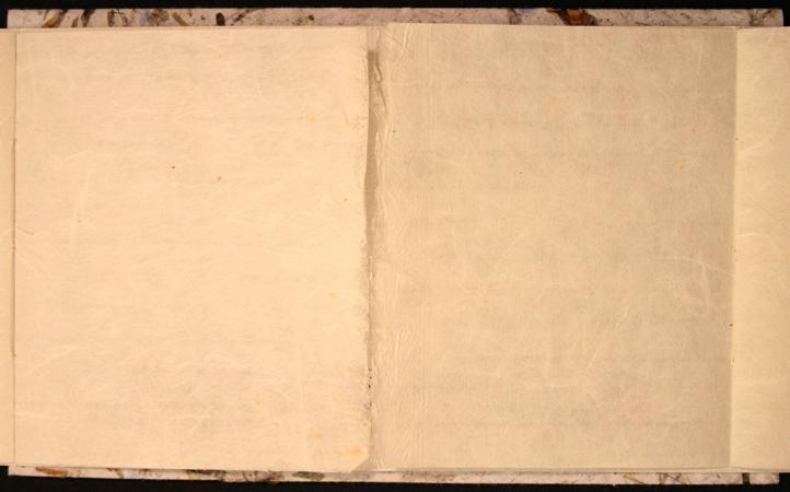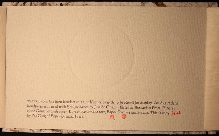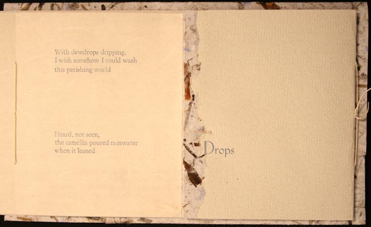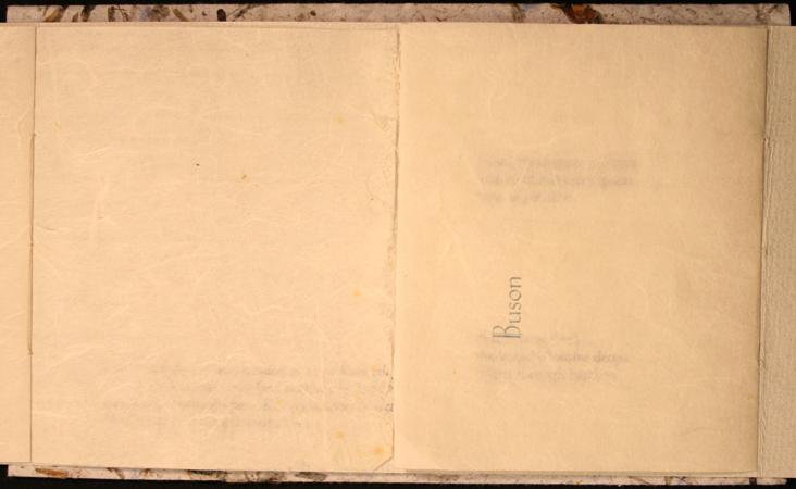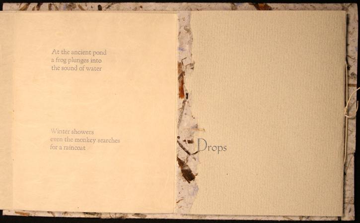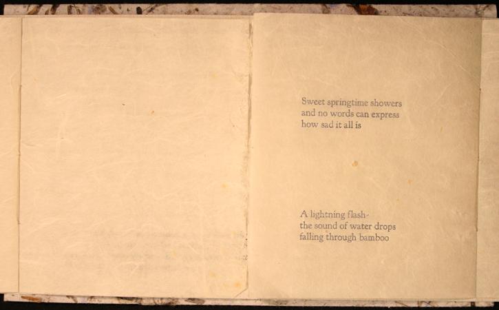 Symmetrical book with a center opening. Title on front cover in letterpress with Haiku poems by Basho on left side and Haiku poems by Buson on right side.Three-hole binding with long white strings.