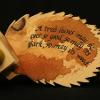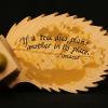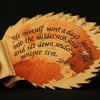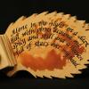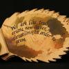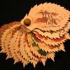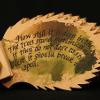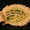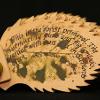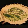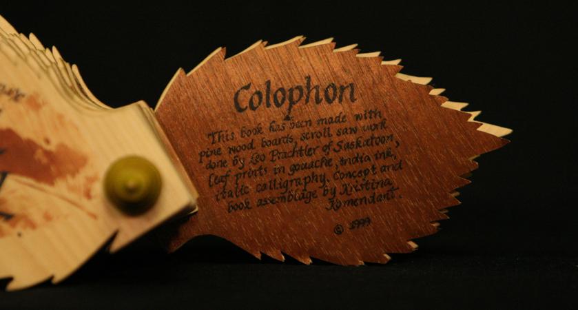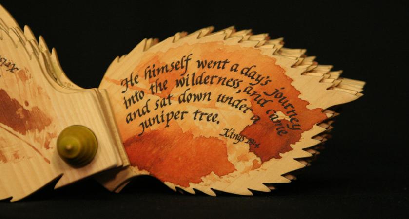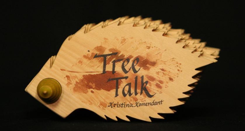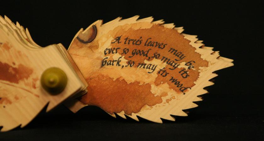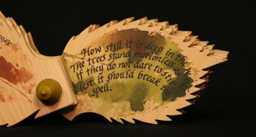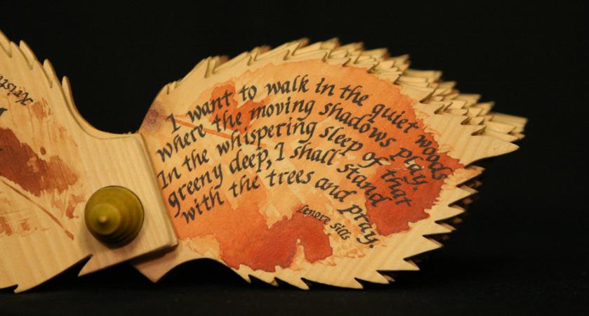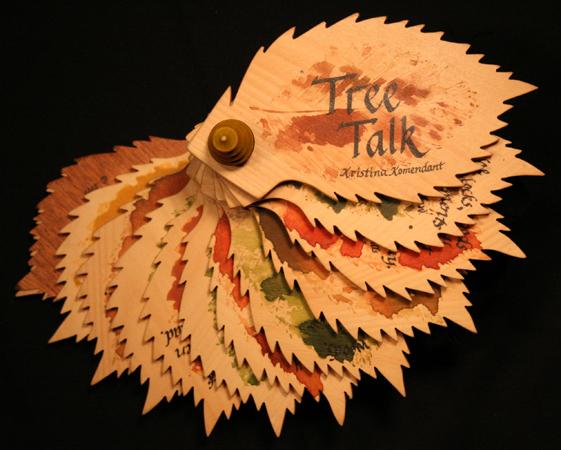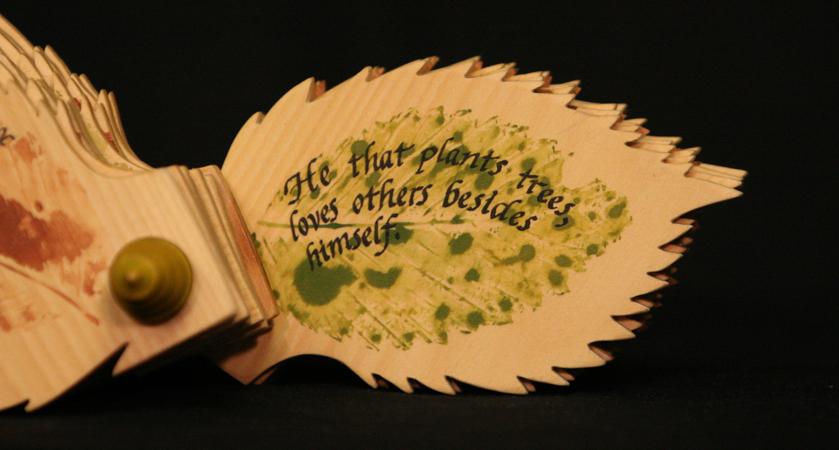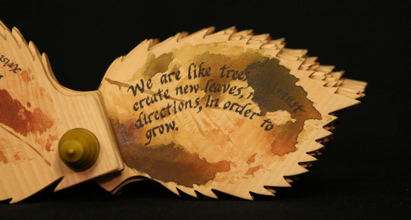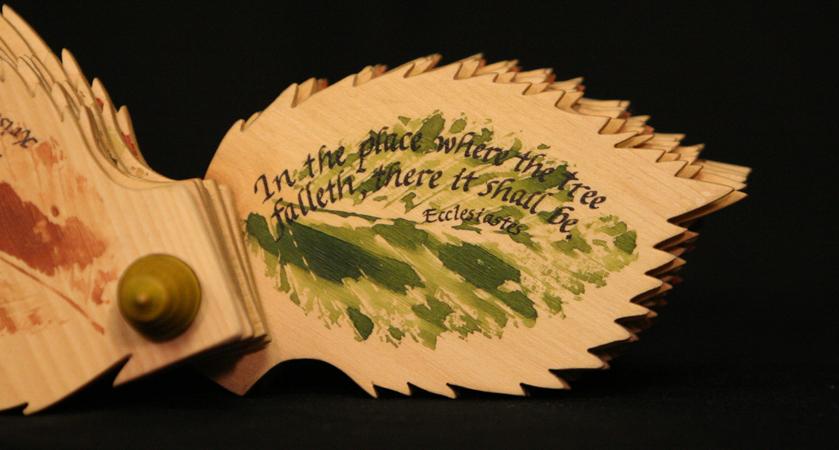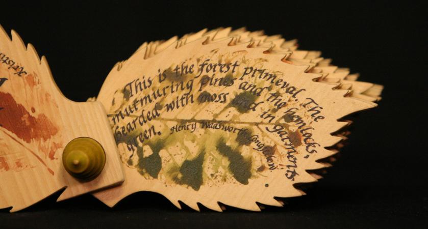 Twelve scroll sawn wooden pages (including cover) made of poplar in the shape of serrated tree leaves. Held together by a light green wood spindle and dowel. There is an imprint of one tree leaf on each page. Each imprint is a different color (brown, green, red) and is done in gouache pigments.