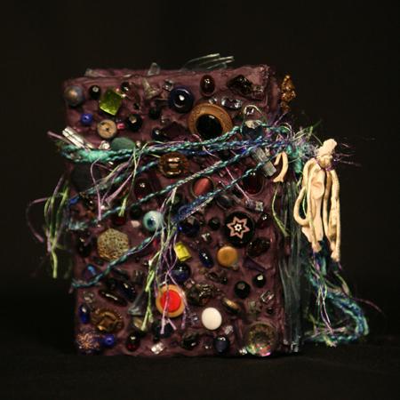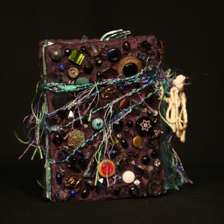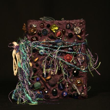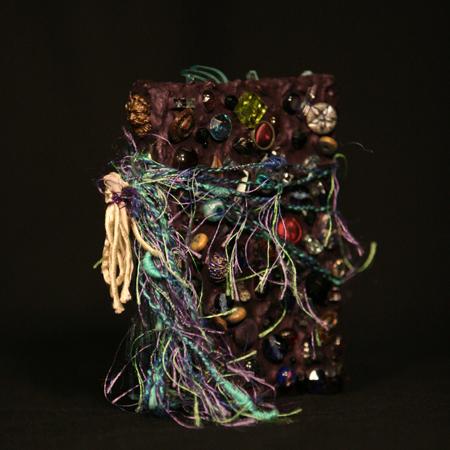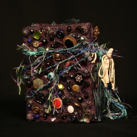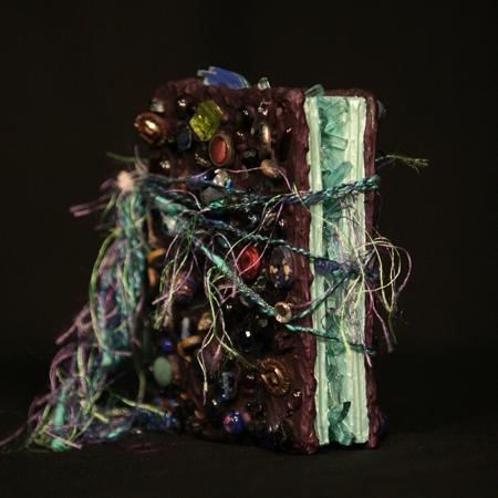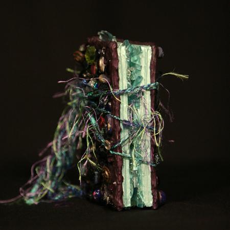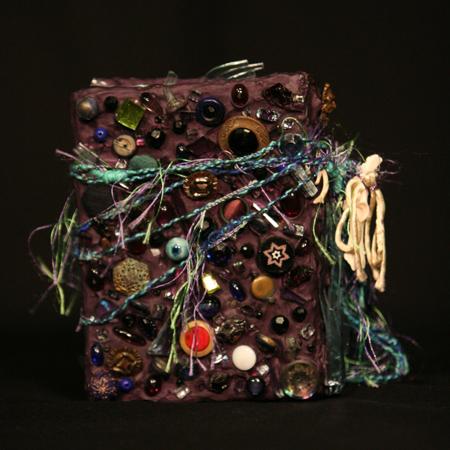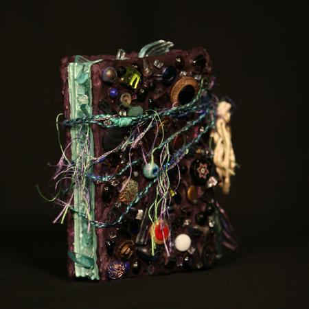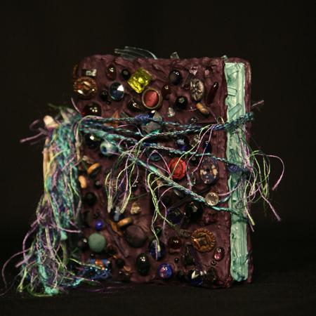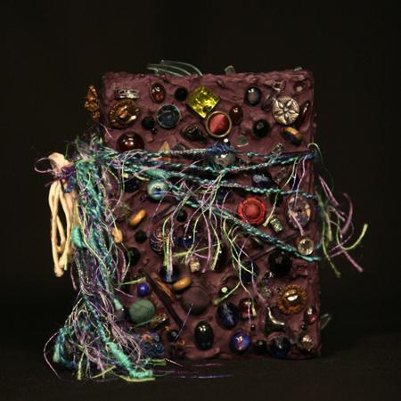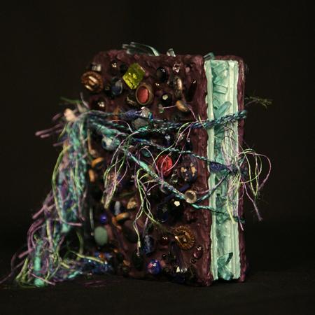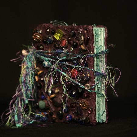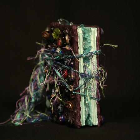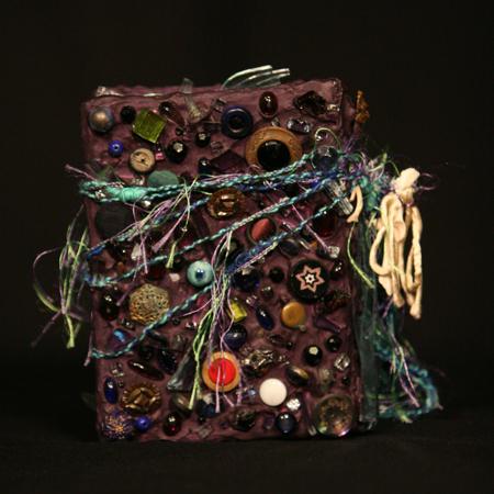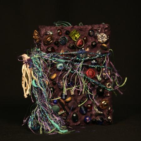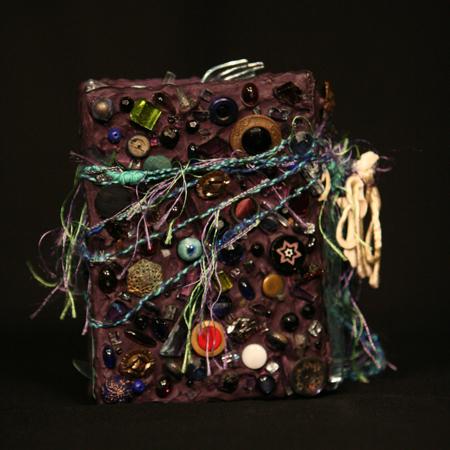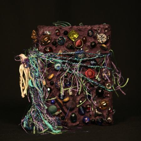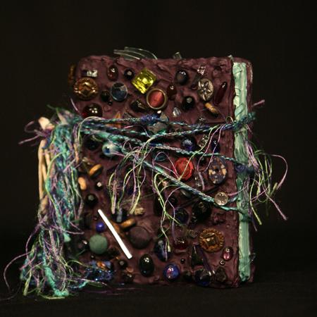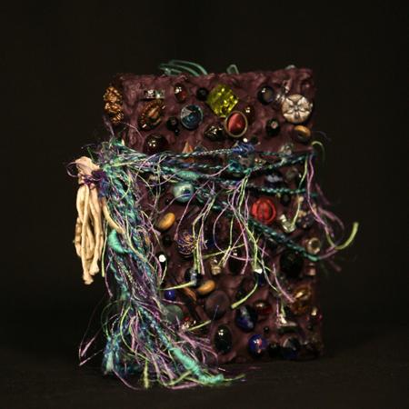 This book doesn't open. It is heavy for its size and has broken glass pieces which makes it necessary to handle with care. It is purple with embedded buttons, beads and broken pieces of glass and embellished with aqua, purple and green yarns and threads. The "pages" are represented by broken glass pieces sticking out from between the covers.