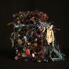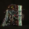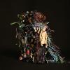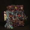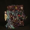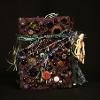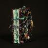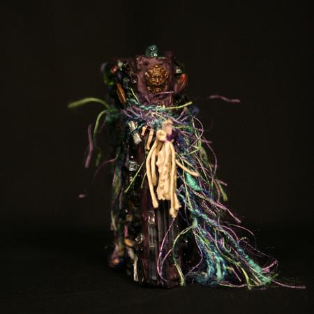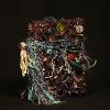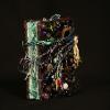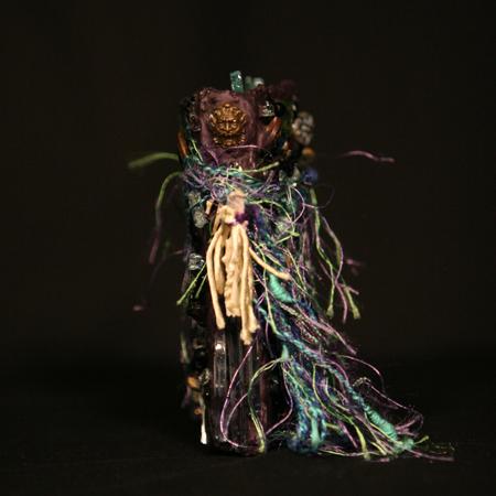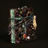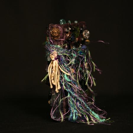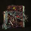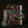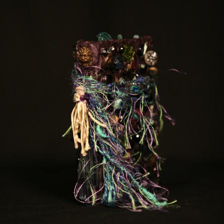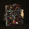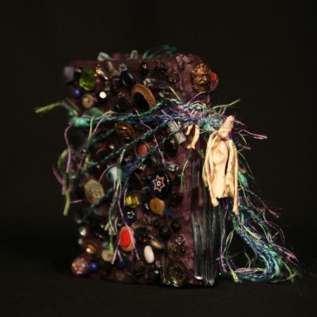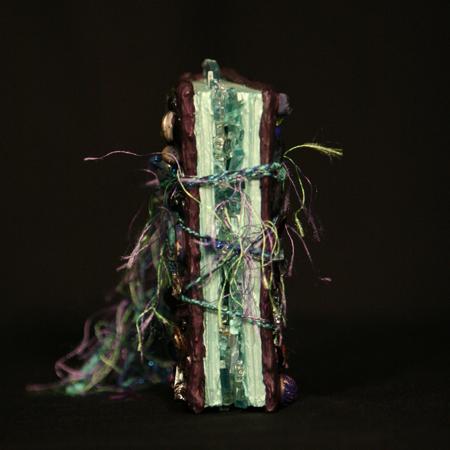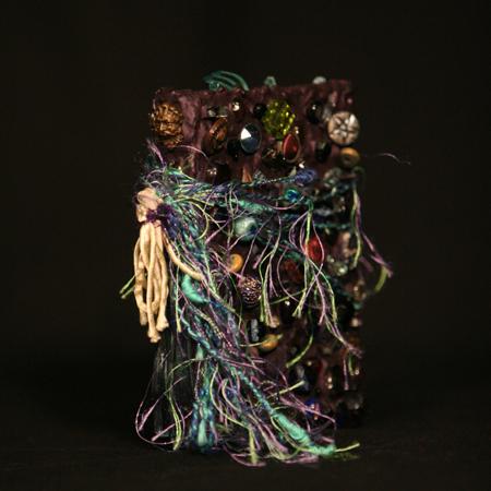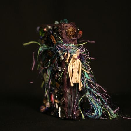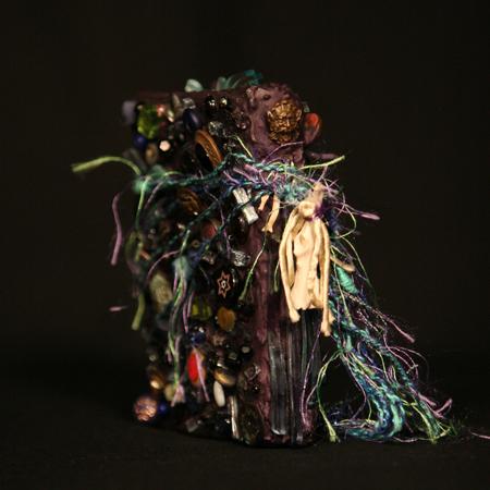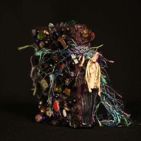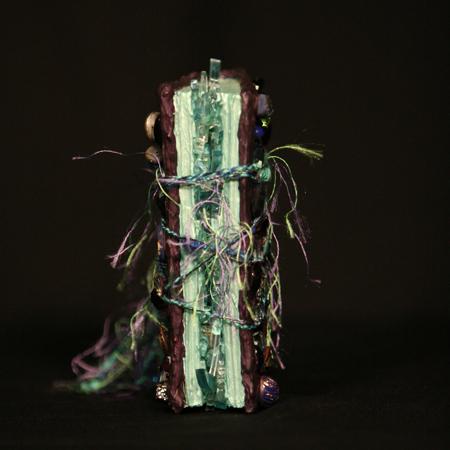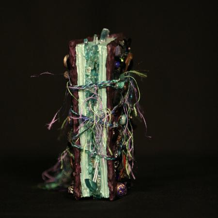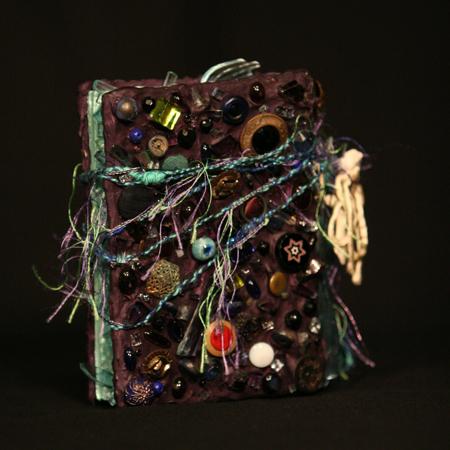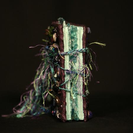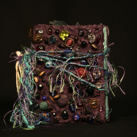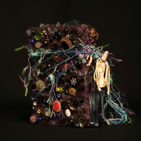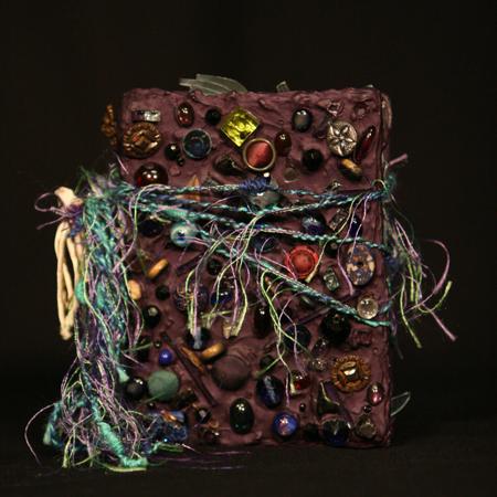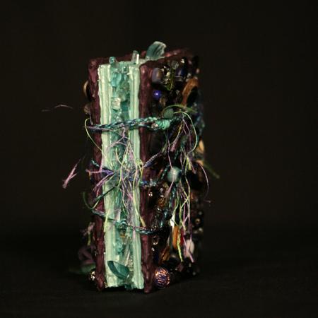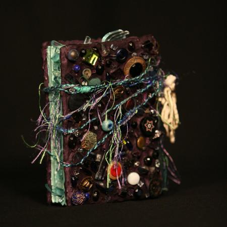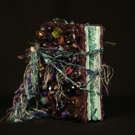 This book doesn't open. It is heavy for its size and has broken glass pieces which makes it necessary to handle with care. It is purple with embedded buttons, beads and broken pieces of glass and embellished with aqua, purple and green yarns and threads. The "pages" are represented by broken glass pieces sticking out from between the covers.