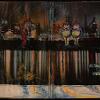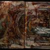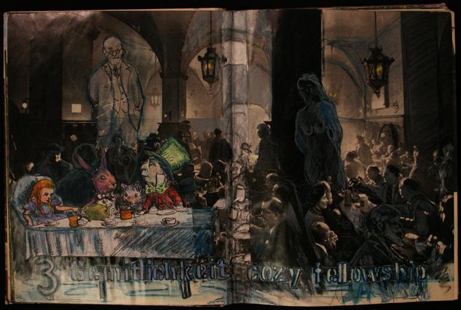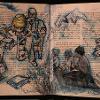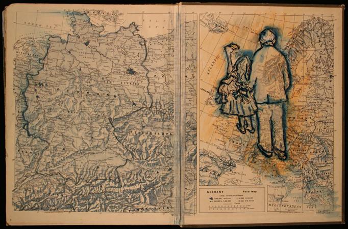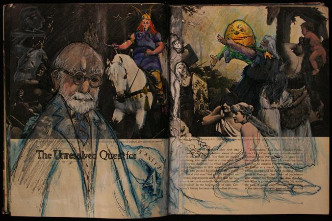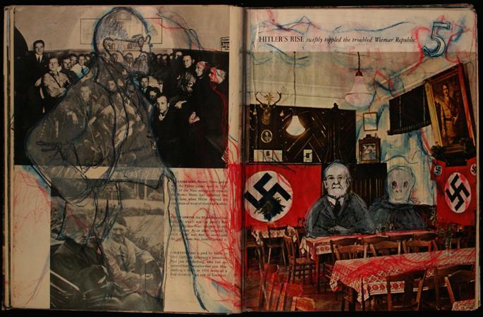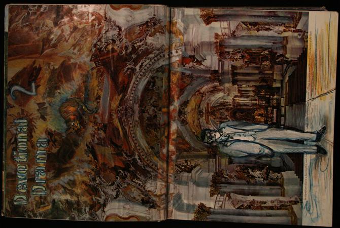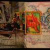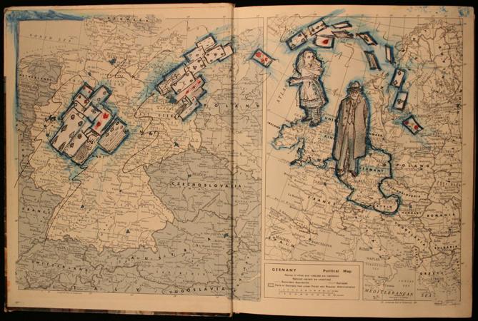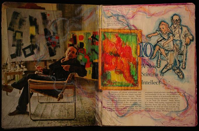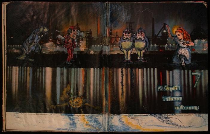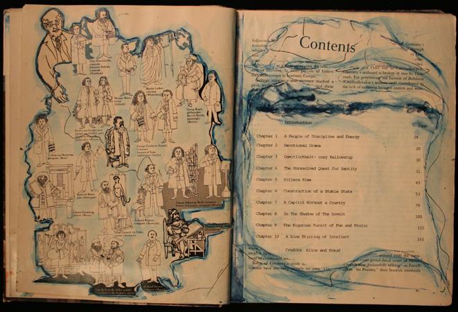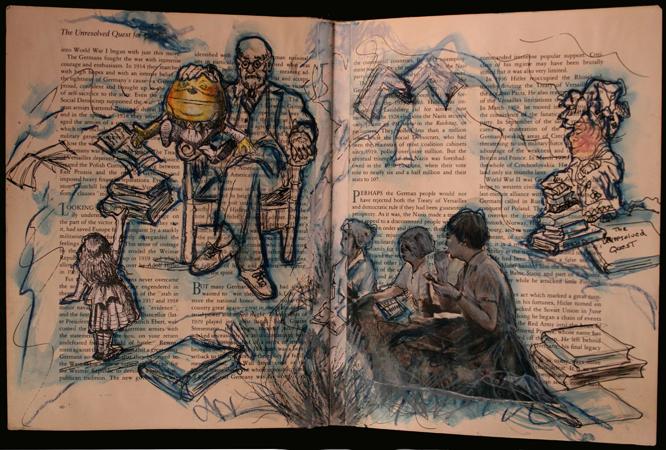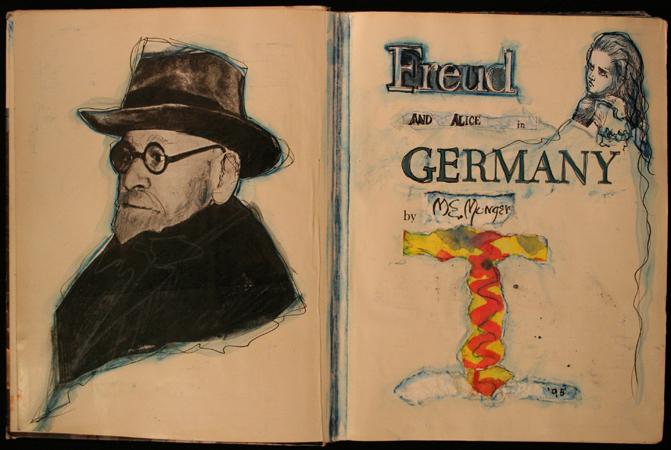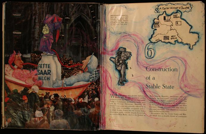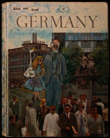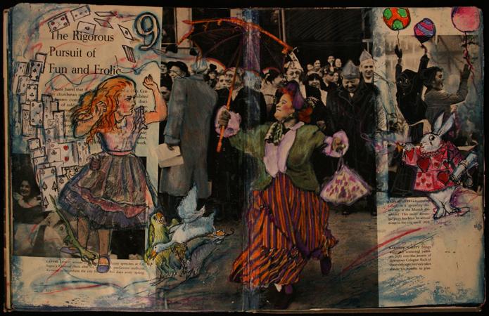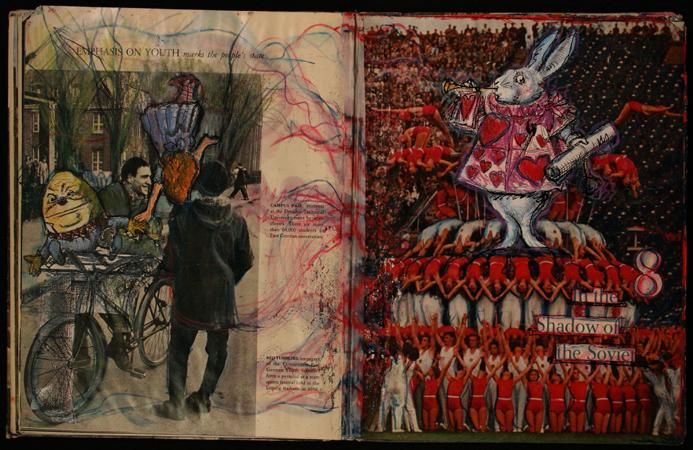 This is a mixed media book. It has 14 multicolored pages and was done in 1995. It is made from an old social studies book about Germany with pages glued together and then embellished with paintings and drawings from Alice in Wonderland.
