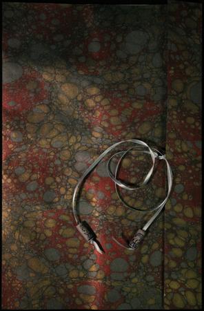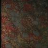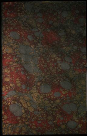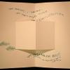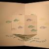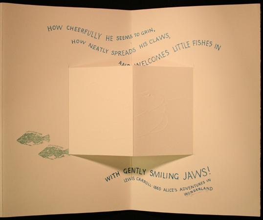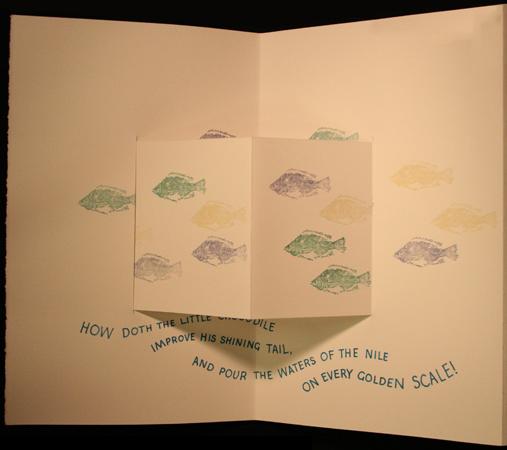 This is a double accordion book with four pages. It has hand-lettered calligraphic wording from Alice's Adventures in Wonderland. The book has a marbled single paper cover of green, gold and red and is embellished with two blue ribbon ties, each with a ceramic fish bead at the end.