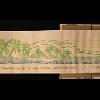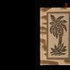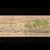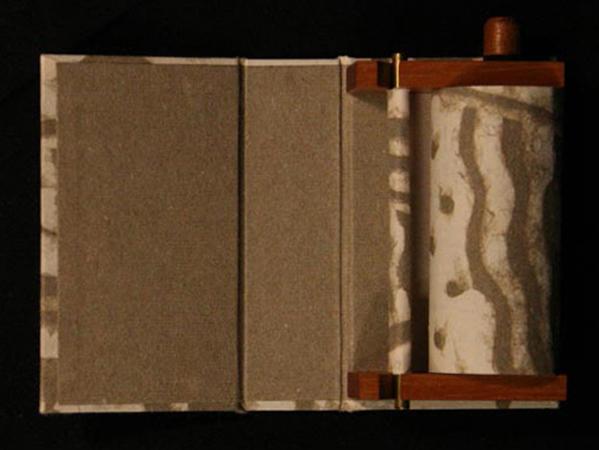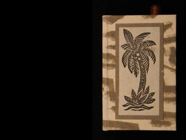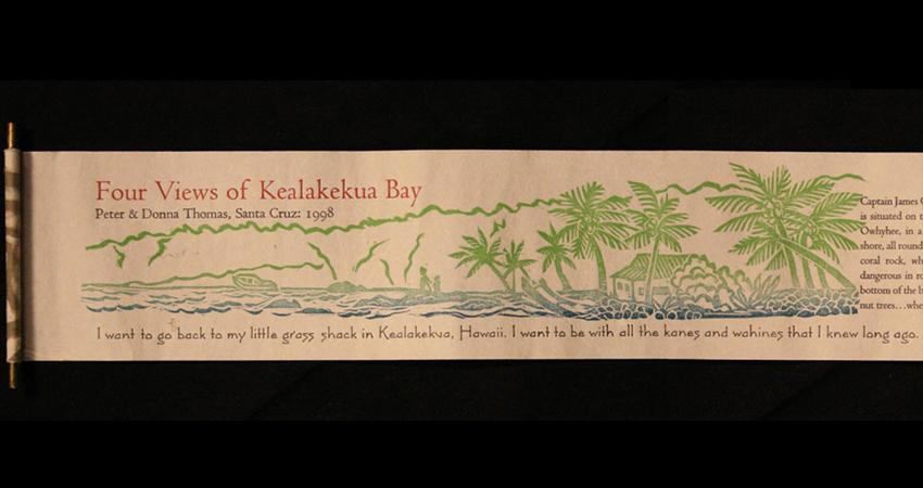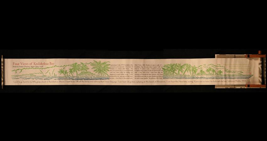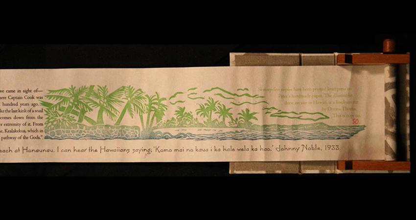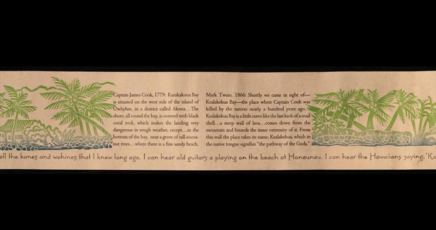 In this innovative scrolling book, four different views (three literary and one pictorial) illustrate the spot where Cook and his crew first discovered the charms of Hawaii. The twenty-inch scrolling page is printed on Peter's handmade paper in five colors. Donna cut the illustration into linoleum while visiting Kealakekua and it is printed in a blue to yellow rainbow of colors. The scroll is on a dowel through blocks of Koa wood, a tree native to that part of Hawaii. The binding is handmade paper decorated with an ancient Hawaiian tapa design with a tapa cloth design formed in the pulp. A small linoleum cut of a palm tree is on the front cover. The four views are from: James Cook, Johnny Noble,