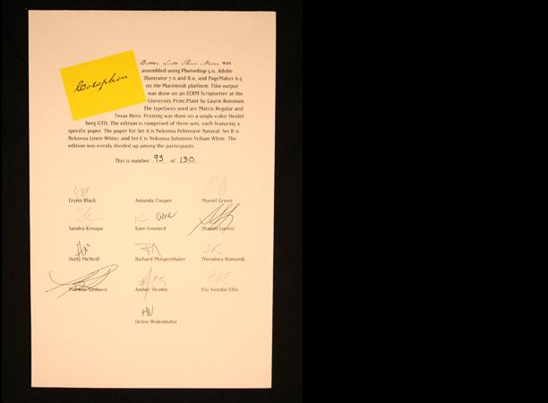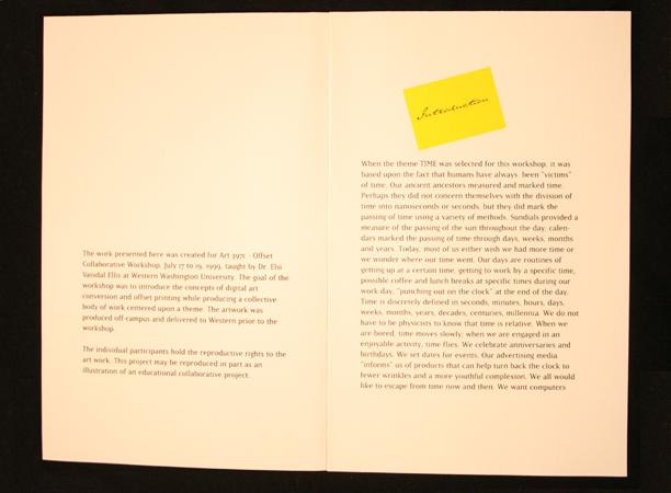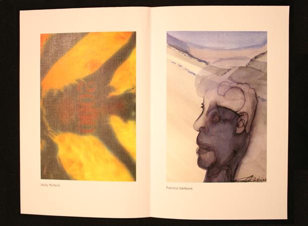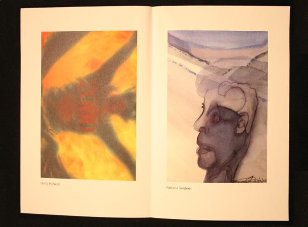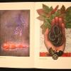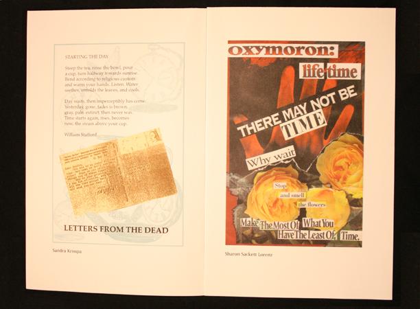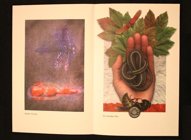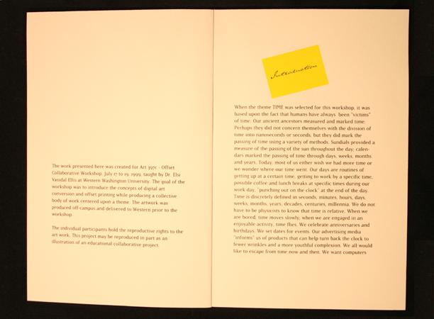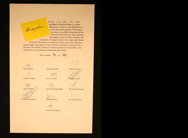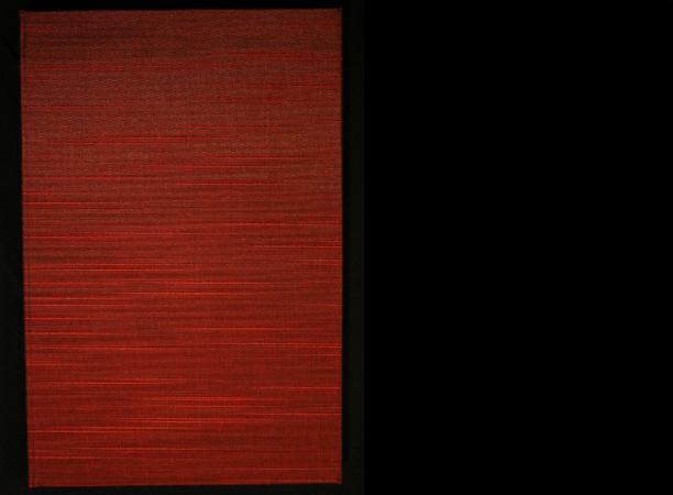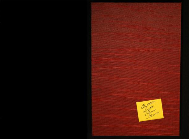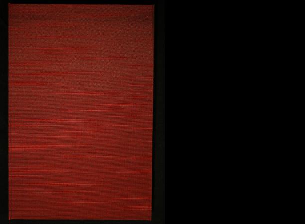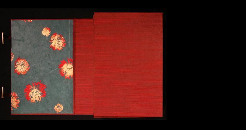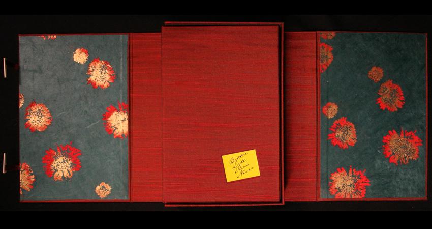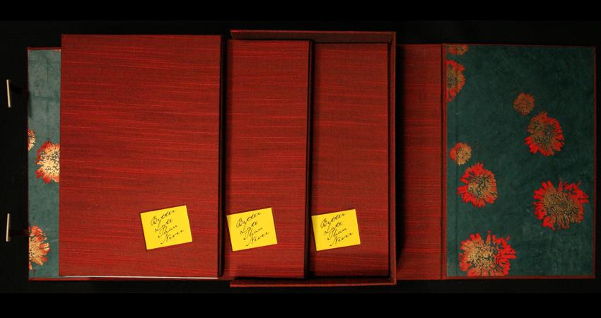 Three separate hard-cover books with loose quarter-folded pages. Each of the three books was printed on a different type of paper, but the series of images are the same in each book. The set was created at the Offset Collaborative Workshop taught by Dr. Elsi Vassdal Ellis at Western Washington University in July 1999. The books and clam style box are covered in red and black woven silk, and each has a yellow square with the title in scripted font in the lower right-hand corner. The interior of the box is lined with green paper embossed with red and gold flowers, and the box top is fastened with two Asian bone clasps on right side. This is #93 of an edition of 130.