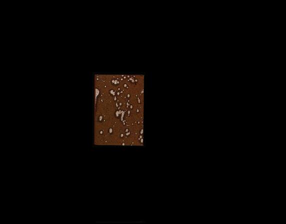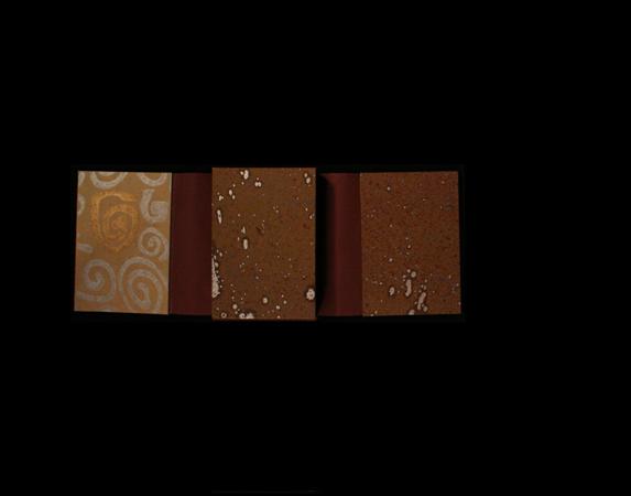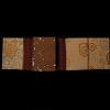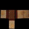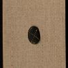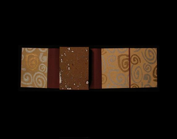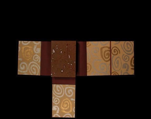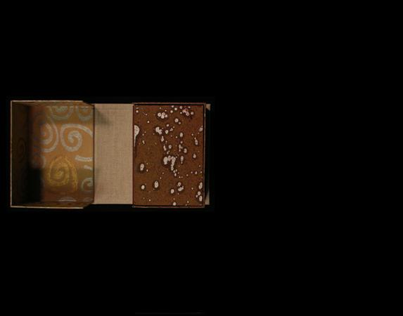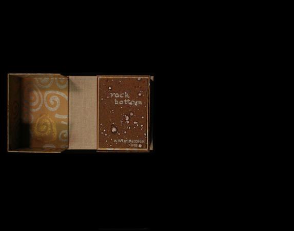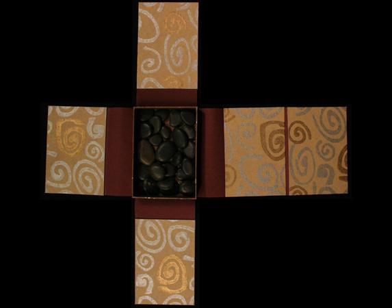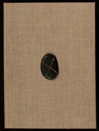 Book structure is box-like with multiple hard covers, which expand out from the bottom of the box in four directions. Inside the wine-colored book, cloth attaches the pattern paper covered hard covers to the box bottom. Black smooth rocks are loose inside the box. A separate hard, yet loose cover, with a silver title and artist name lifts off completely from the closed box-book. The clam style box is covered in tan linen with two different paper patterns on the edges inside and out. One black oval stone is attached to the box centered cover with brass wire. Made in 1998.