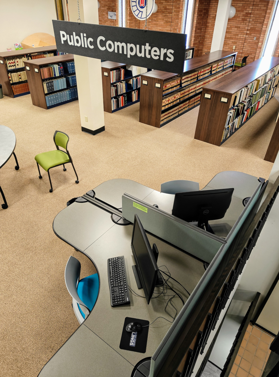 The library has 2 computers available for community patrons on the 2nd floor. Remember to follow all IT policies when using university technology. A login card is no longer required, but please remember to close all programs before ending your session.