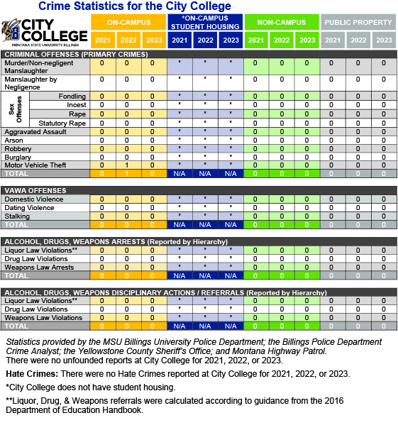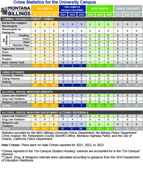 NON-CAMPUS BUILDING OR PROPERTY: any building or property owned or controlled by a student organization recognized by the institution; or any building or property, (other than a branch campus) owned or controlled by an institution that is used in direct support of or relating to the institution’s educational purpose, is frequently used by students, and is not within the same reasonably contiguous geographical area of the institution. Data from the Billings Police Department is listed in this category.