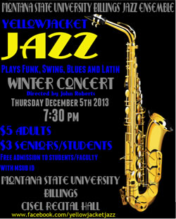 MSU BILLINGS NEWS SERVICES — The MSU Billings Jazz Ensemble will perform at 7:30 p.m. in Cisel Recital Hall on December 5. They will be serving up a healthy dose of funk, swing, Bossa Nova, Blues, and New York Mambo.