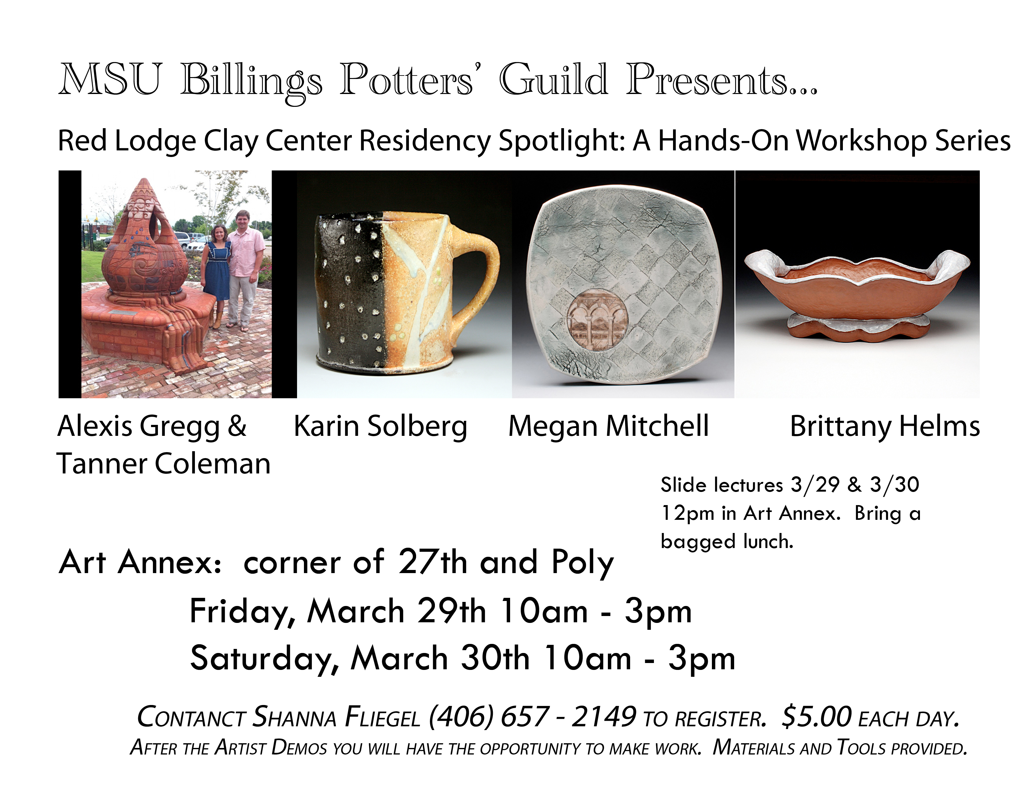 MSU BILLINGS NEWS SERVICES — Montana State University Billings Potters’ Guild will host ceramic artists from the Red Lodge Clay Center on Friday, March 29 and Saturday, March 30 in the Art Annex from 10 a.m. to 3 p.m. The Art Annex is located on the corner of Poly and 27th Street.