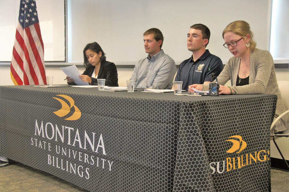 From the left are Dr. Nisha Bellinger, assistant professor, Adam Nesheim, Clay Sluggett and Annemarie Overcast presenting the results of the 30th Annual Montana Poll conducted by MSUB.