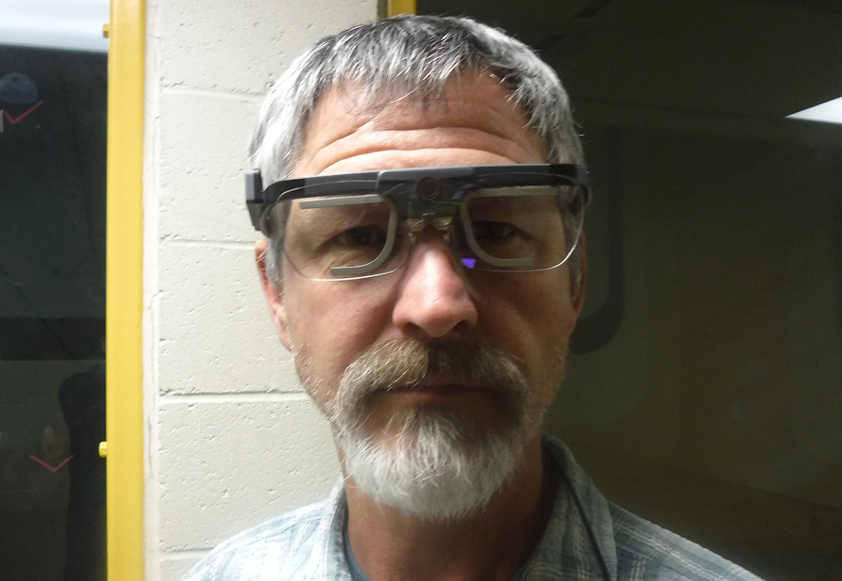 Outdoor Adventure Leadership Assistant Professor Clinton Culp models Tobii eye-tracking glasses worn by research participants while climbing MSUB’s rock wall. (Photo by Eric Brown)