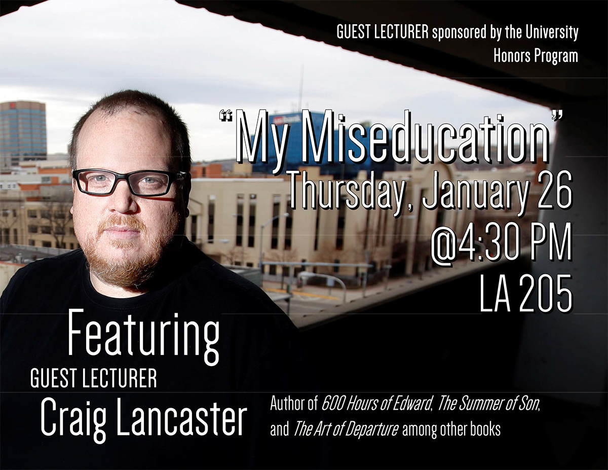 Lancaster has been the MSUB writer-in-residence, hosted by the Honors Program, and will discuss “My Miseducation,” during the event. His lecture is an extension of his fall seminar, Finding Your Way into Fiction, which combined students and community auditors.
