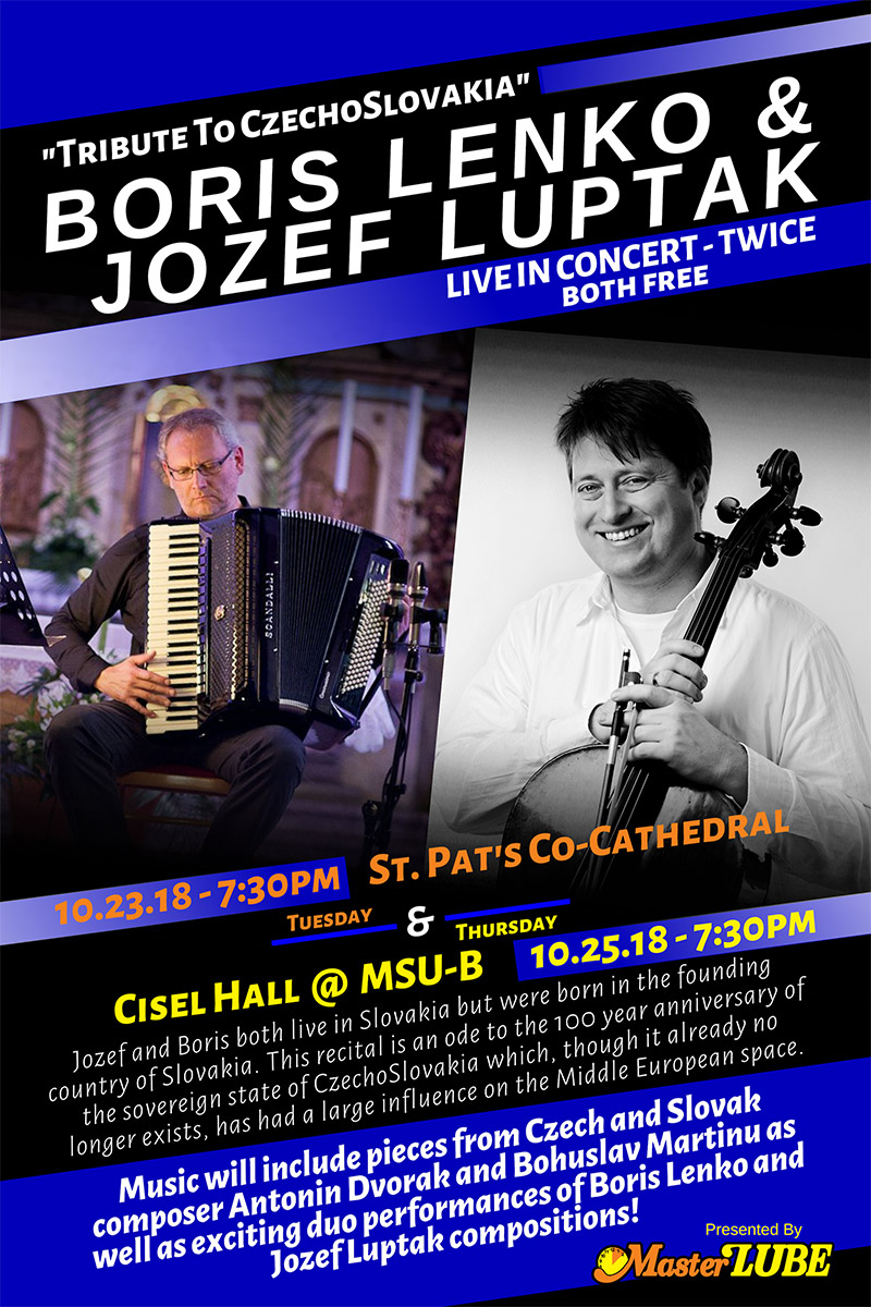 MSU BILLINGS NEWS SERVICES — Two world-class musicians, Jozef Luptak and Boris Lenko, will perform a concert “Tribute to CzechoSlovakia” at Cisel Hall, on October 25 at 7:30 p.m.